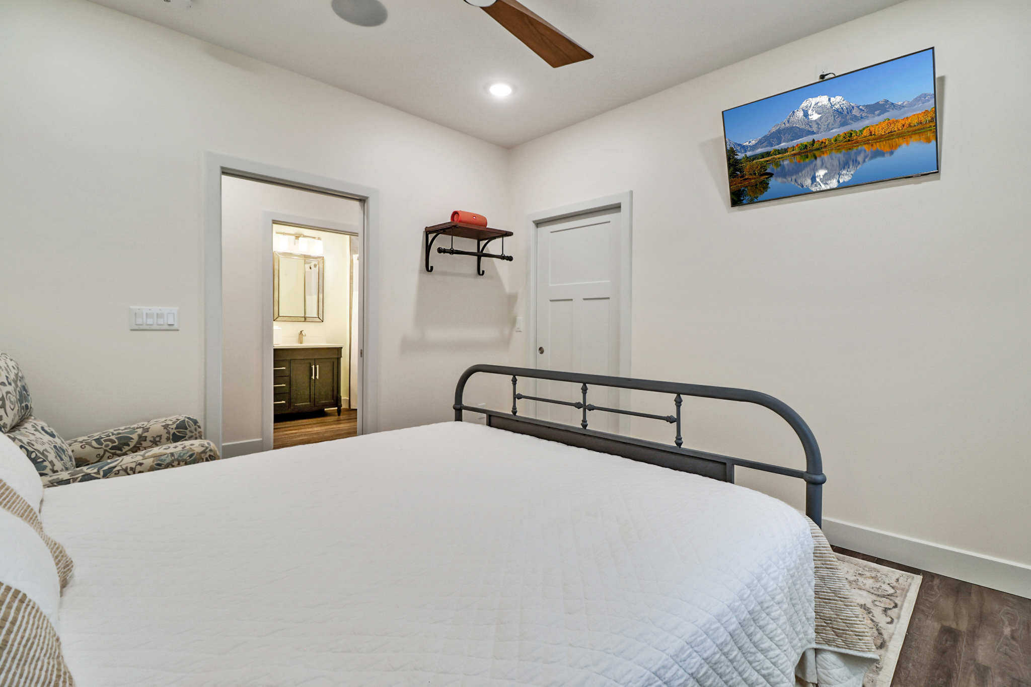 The primary suite is a private sanctuary with an 18′ x 15′ bedroom, spa-like bathroom, and a 15′ x 8′ custom walk-in closet with built-in cabinetry. The guest suite includes a spacious bedroom, its own oversized custom closet, and a full bathroom with dual sinks. A one-of-a-kind craft and laundry room doubles as a hobby space, with extensive cabinetry, a utility sink, and integrated TV for convenience.