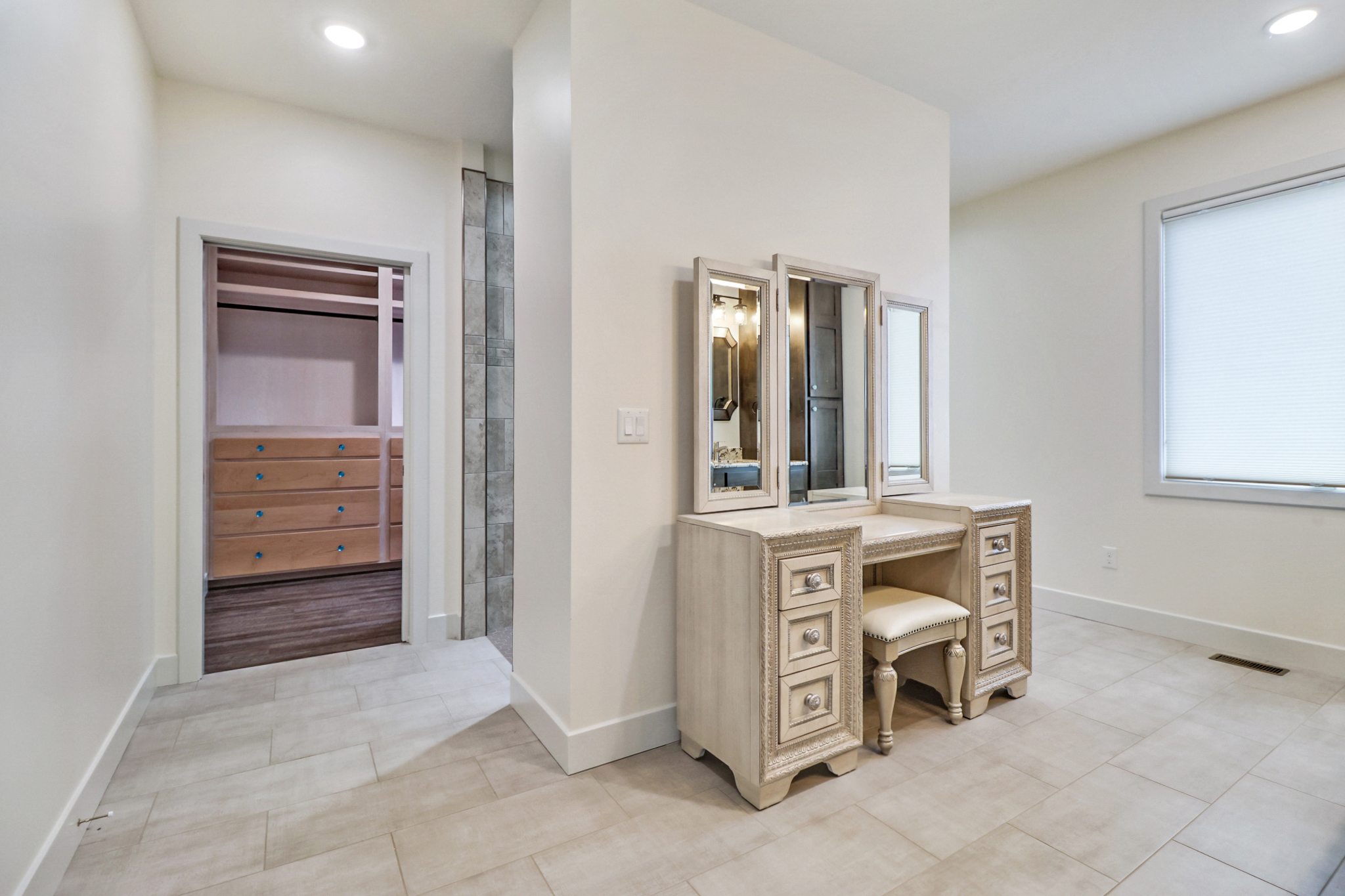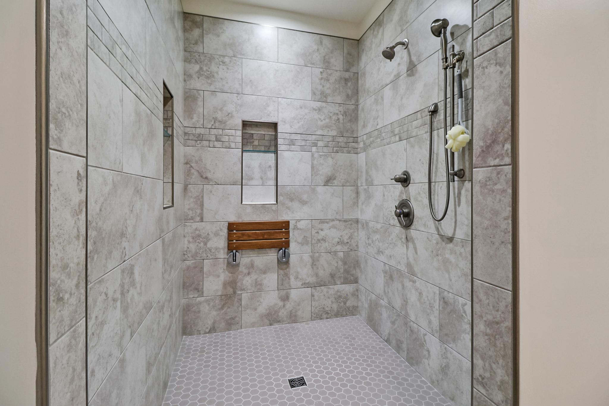 - Large tiled walk-in shower (5’ x 5’)