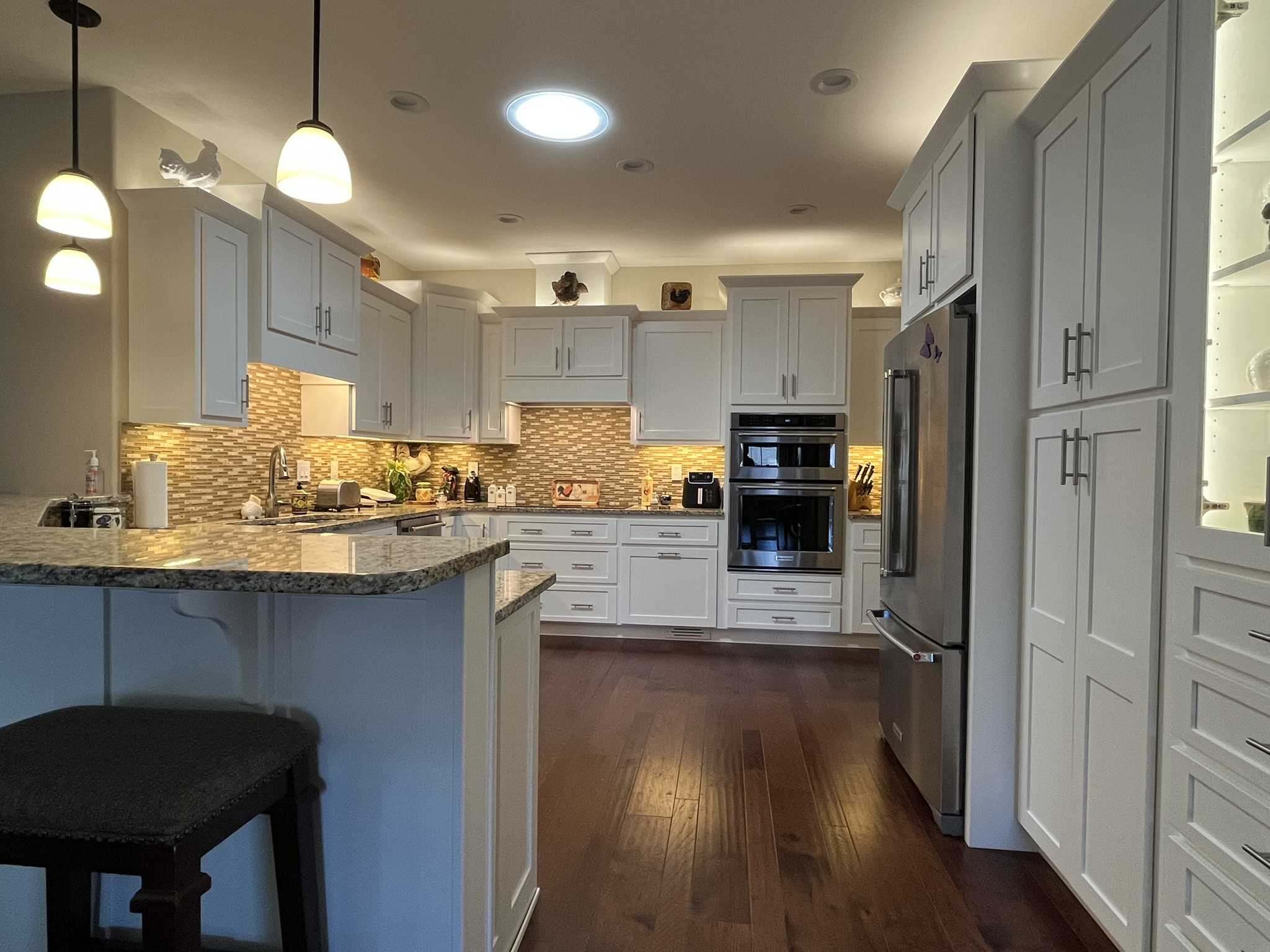 - Has one full wall of custom/adjustable white wooden shelving