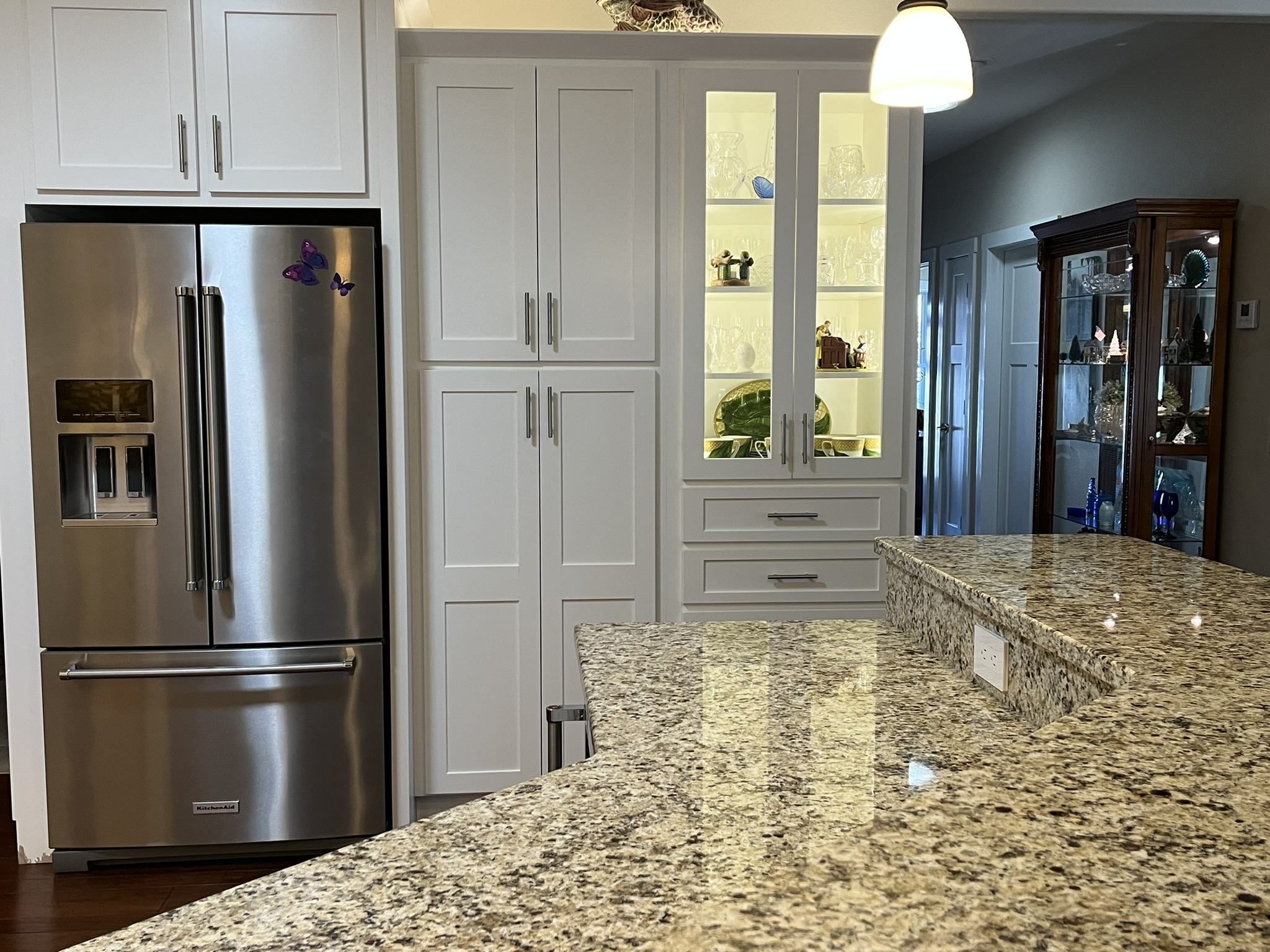 - Upper display cabinet is lighted with glassed doors