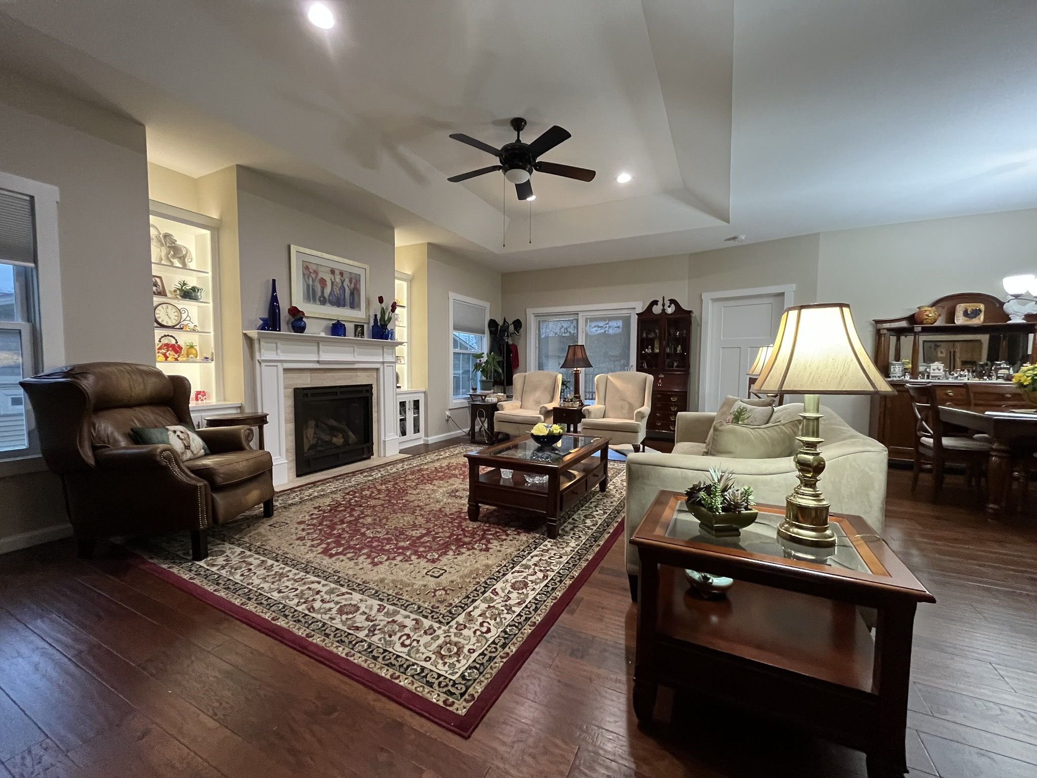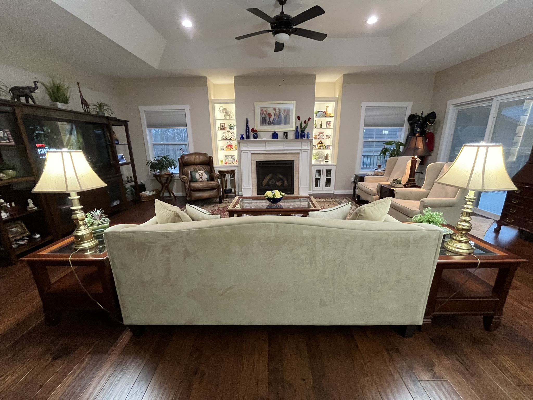 - Gas log fireplace surrounded with lighted shelving
