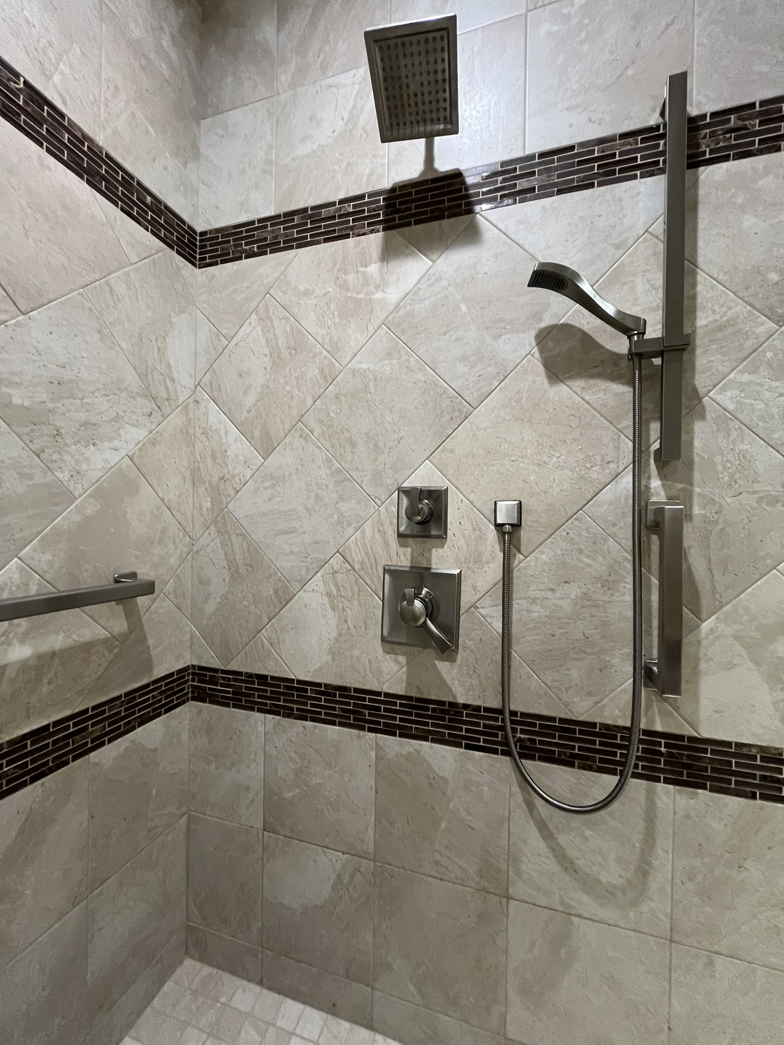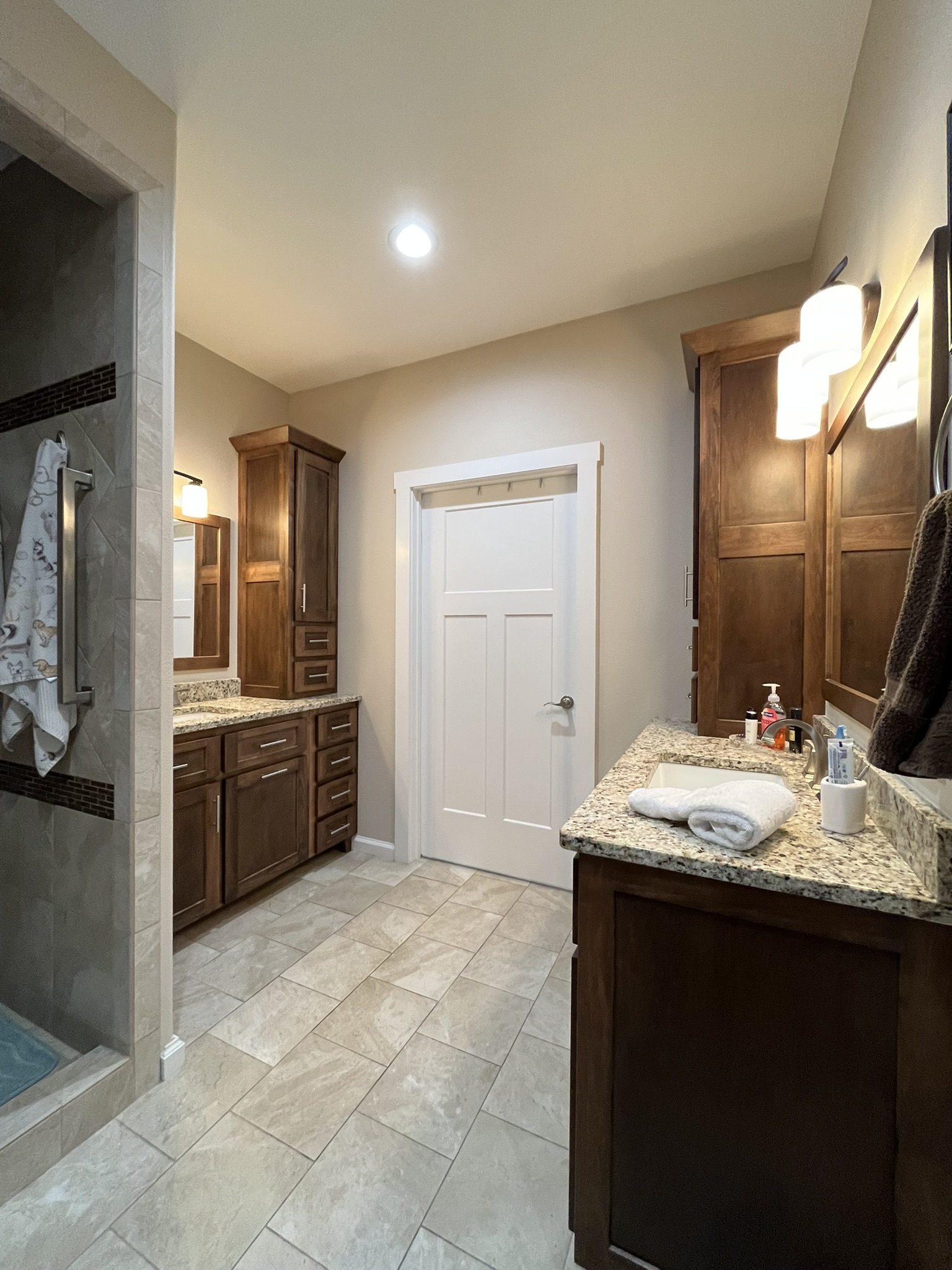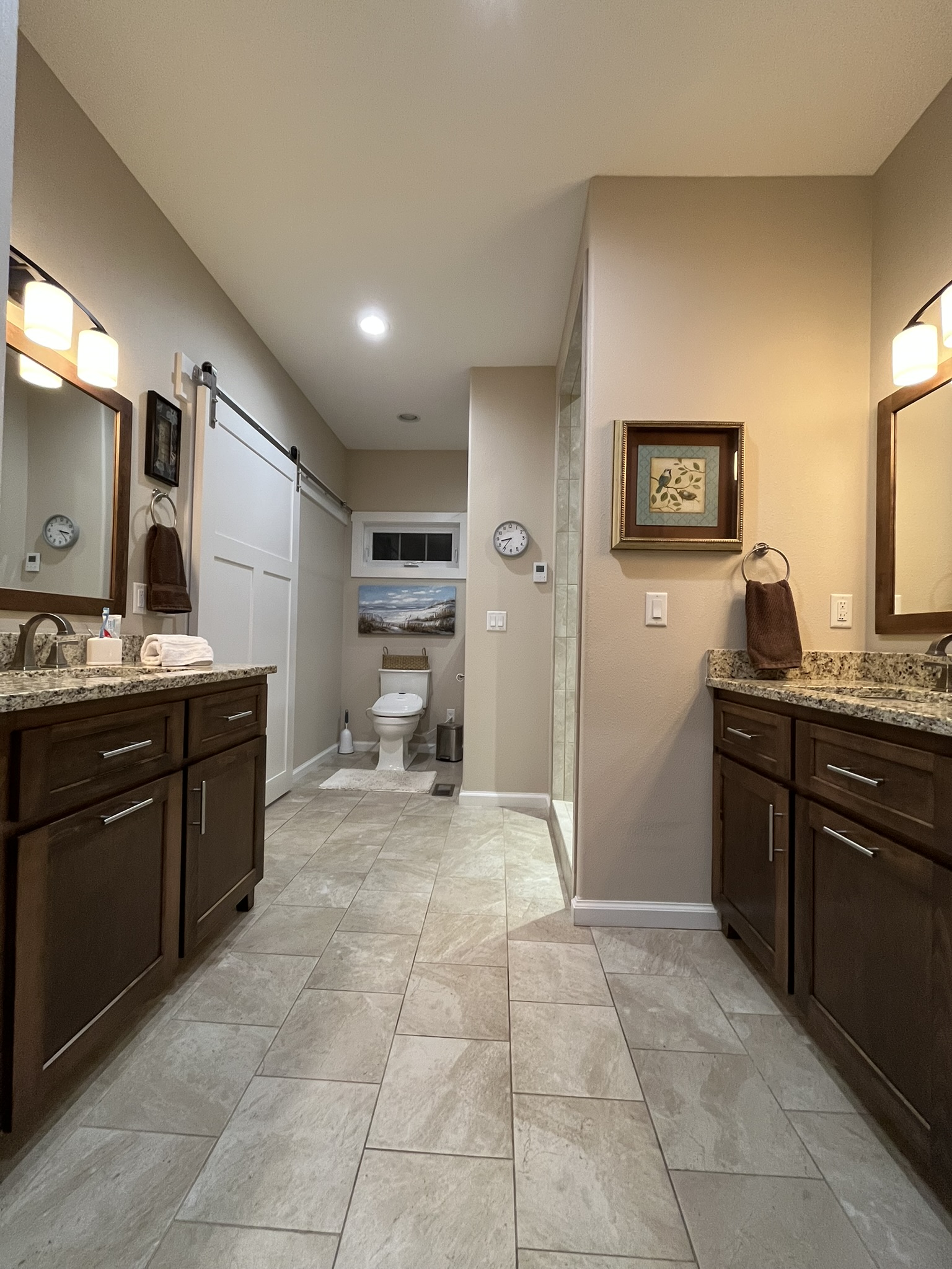 - Master bath has two opposite wash basins, large walk-in shower with a built-in corner seat, and multiple, easily accessible grab bars