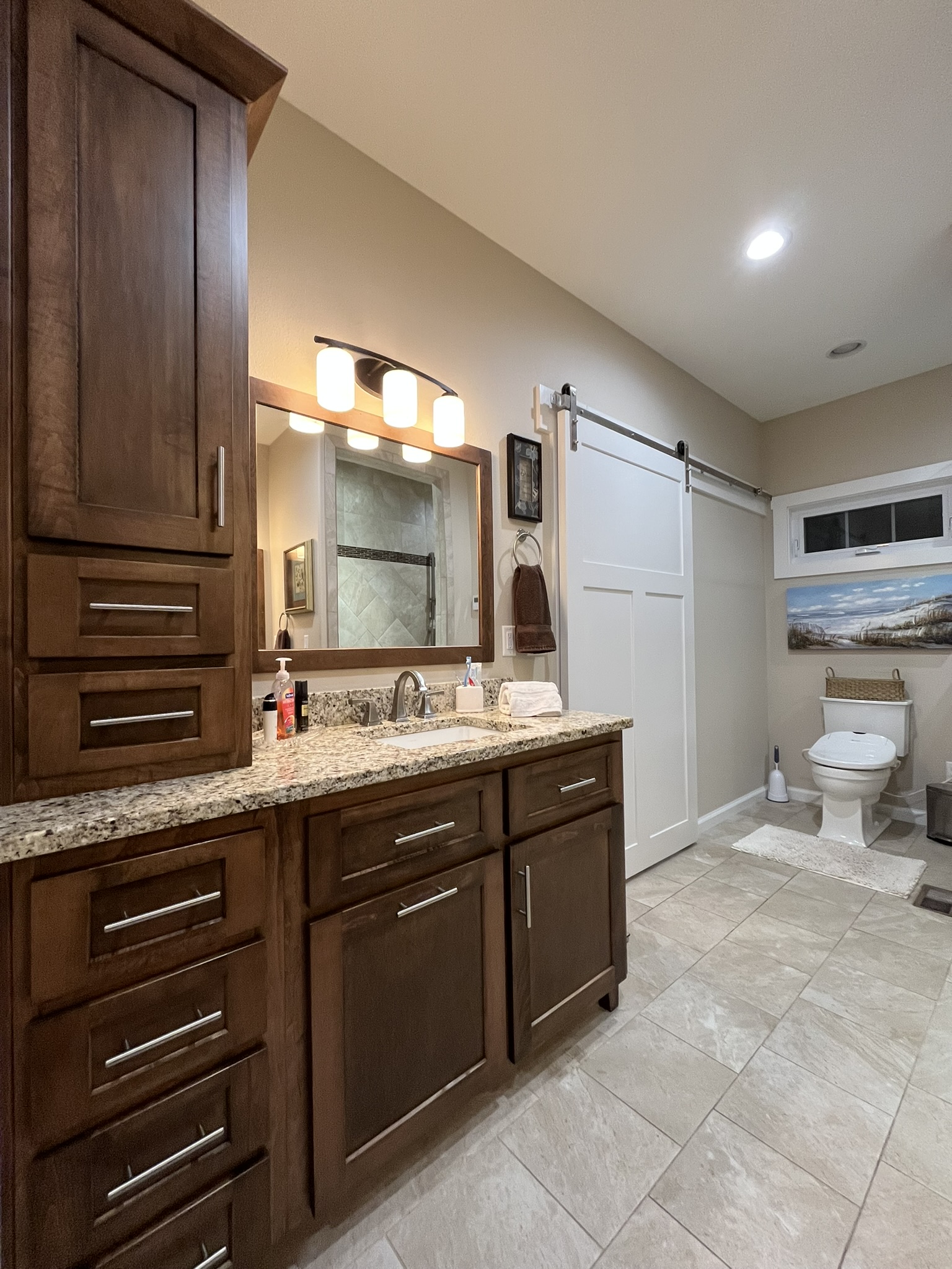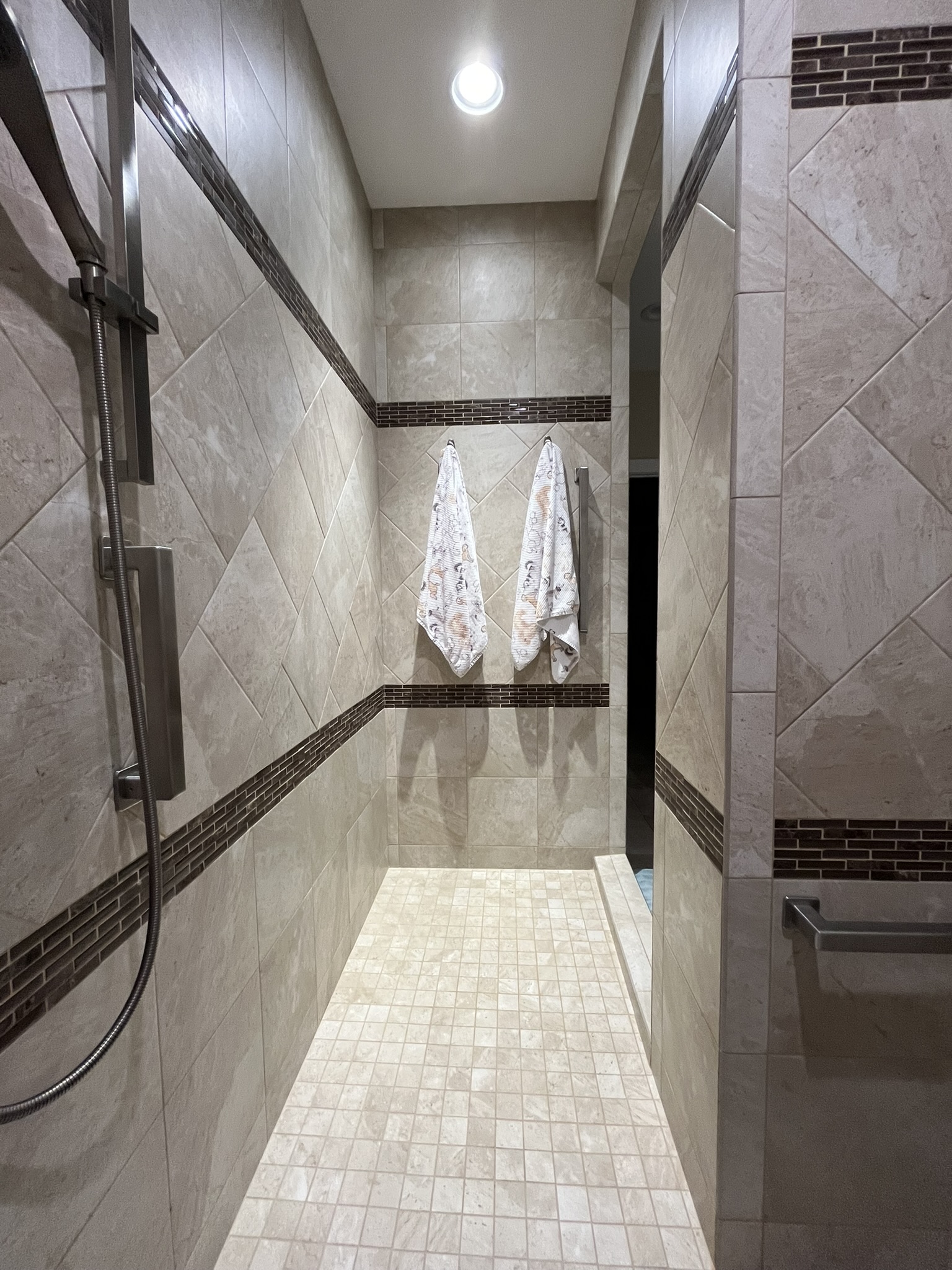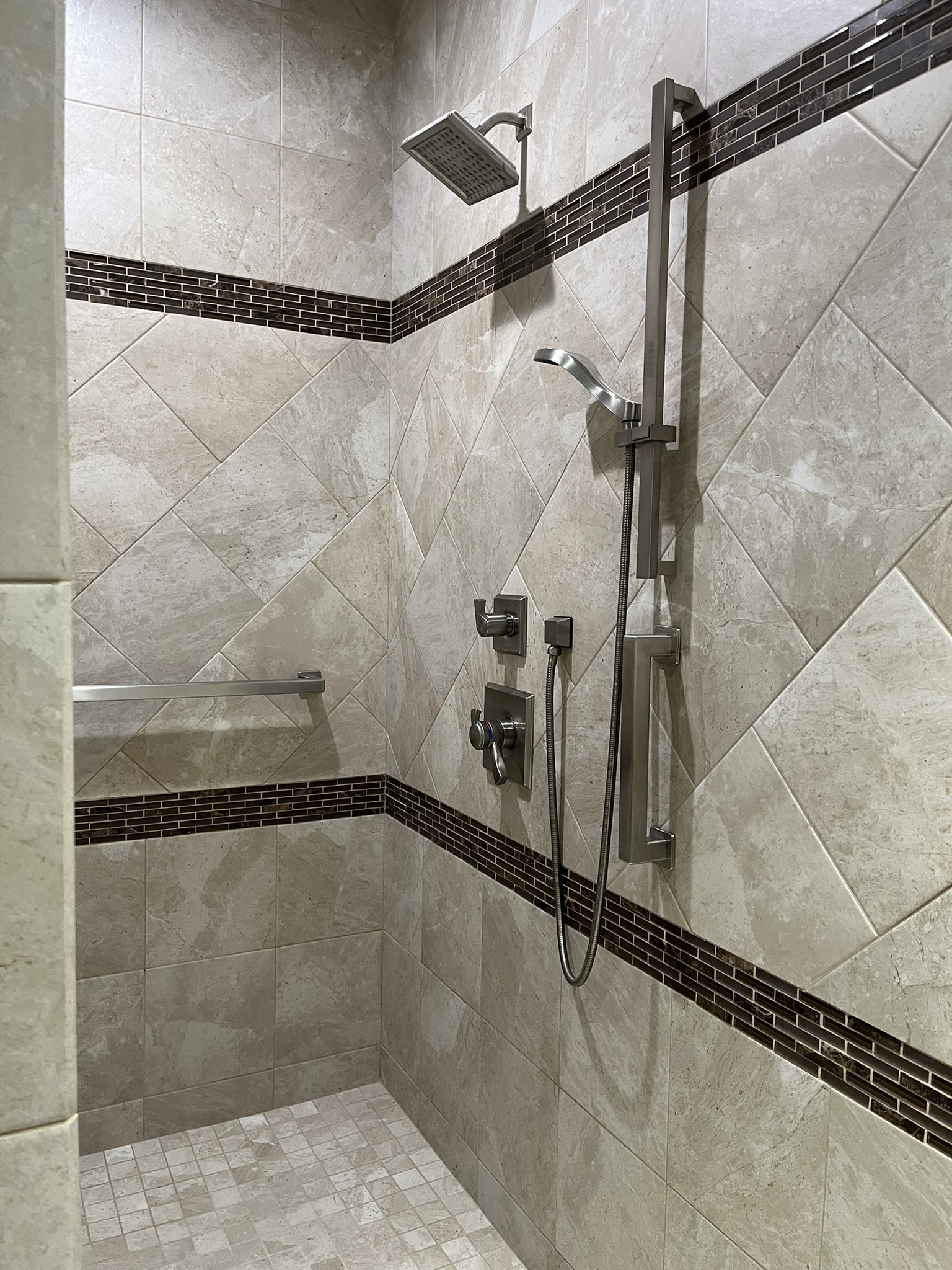 - Master bath has two opposite wash basins, large walk-in shower with a built-in corner seat, and multiple, easily accessible grab bars