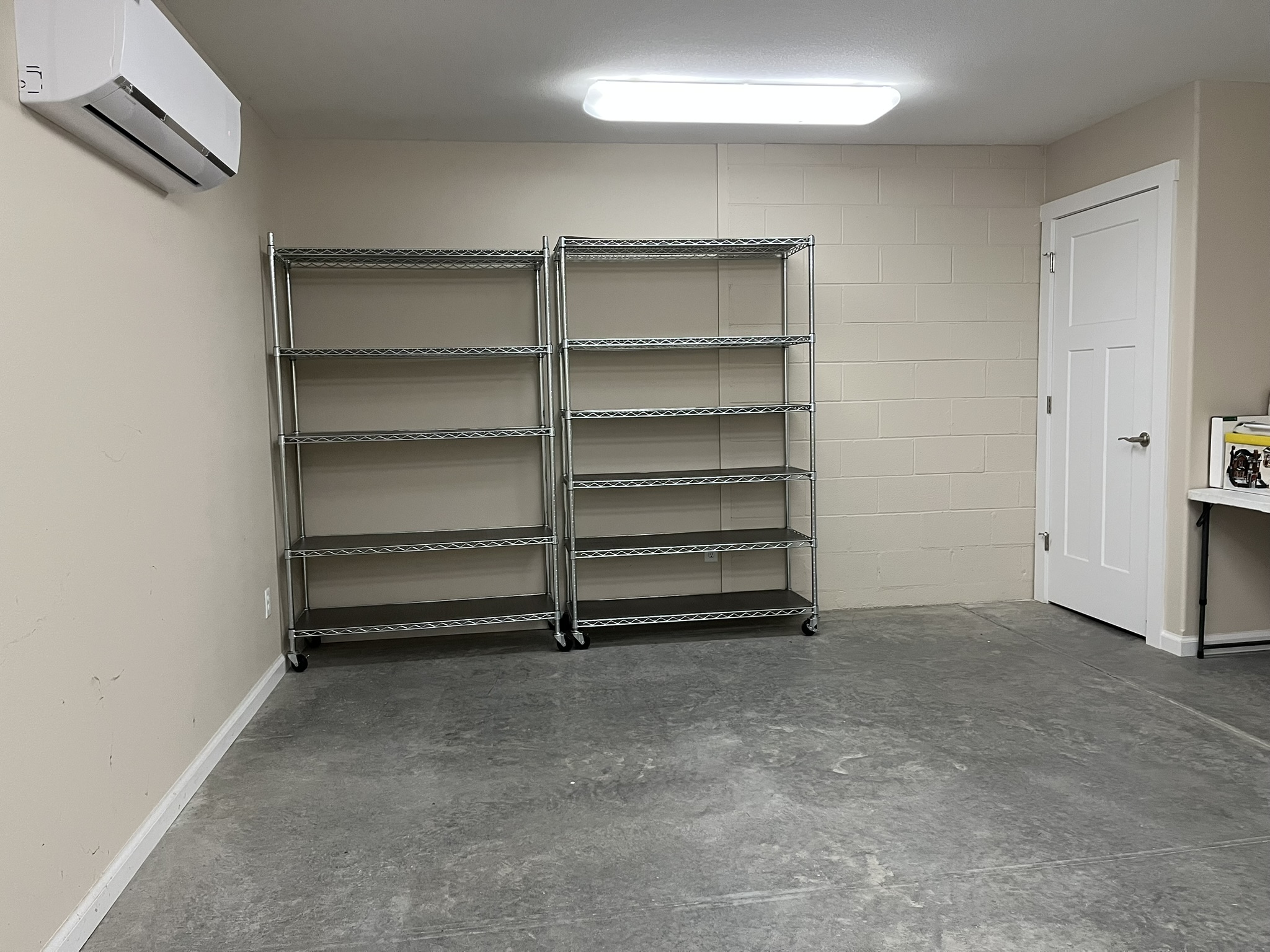 - Full wall of closeted rolling movable/metal pantry shelves