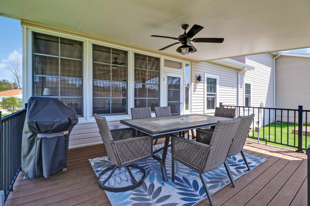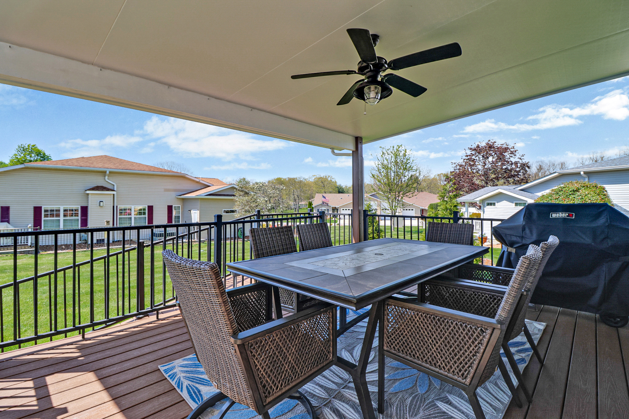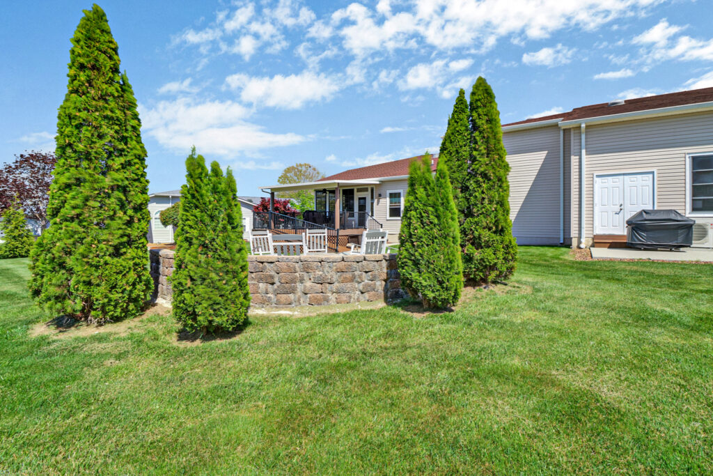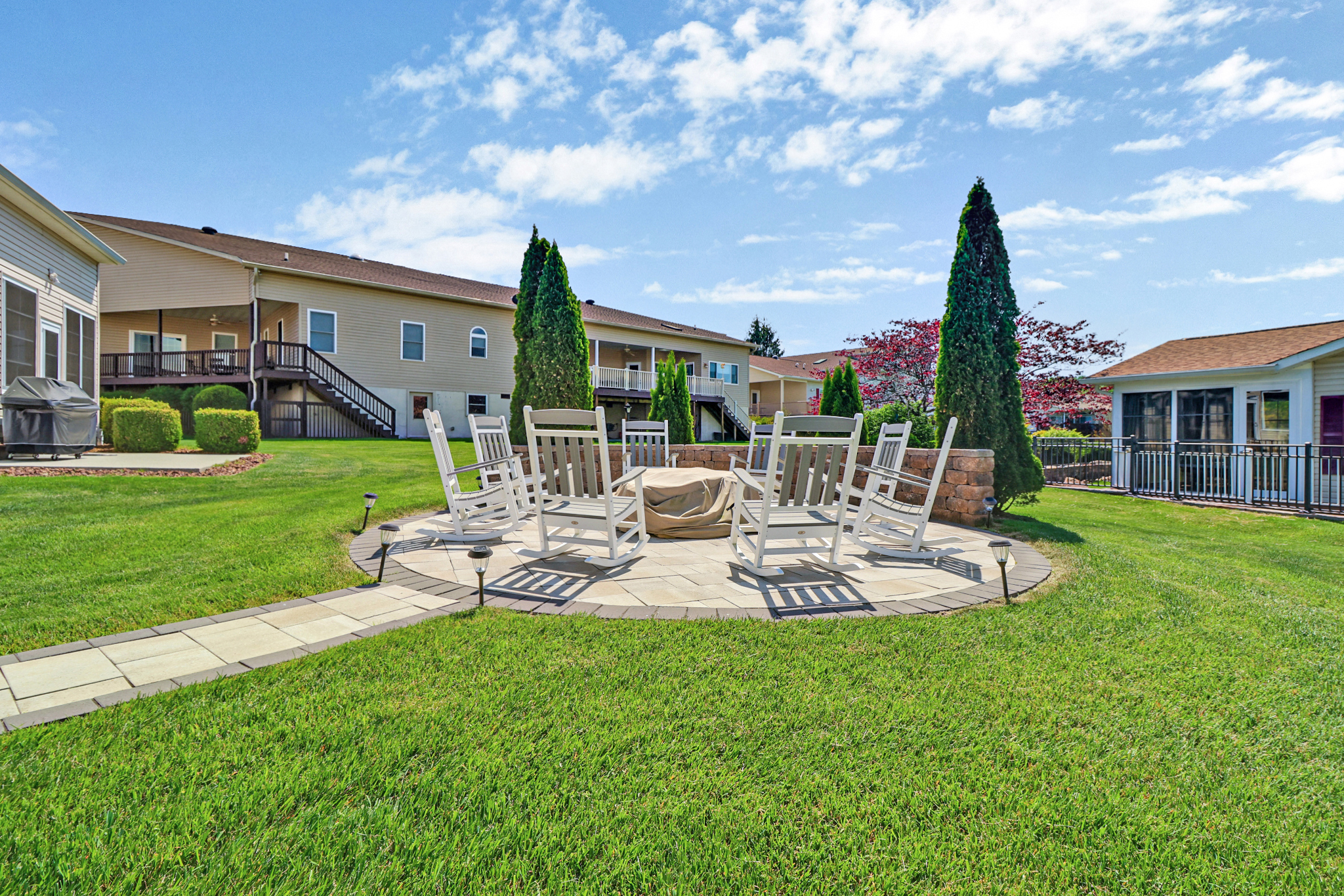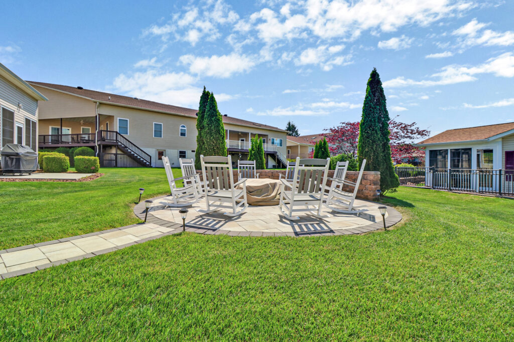 The outdoor living spaces truly elevate the property. A covered composite deck with ceiling fan creates a comfortable space for outdoor dining or relaxing through multiple seasons. Just beyond, the backyard opens to a beautifully designed paver patio and gas fire pit area surrounded by retaining wall seating, privacy-enhancing evergreen landscaping, and open green space that feels both inviting and usable. Whether hosting guests or enjoying a quiet evening outside, the layout was clearly designed with lifestyle in mind.