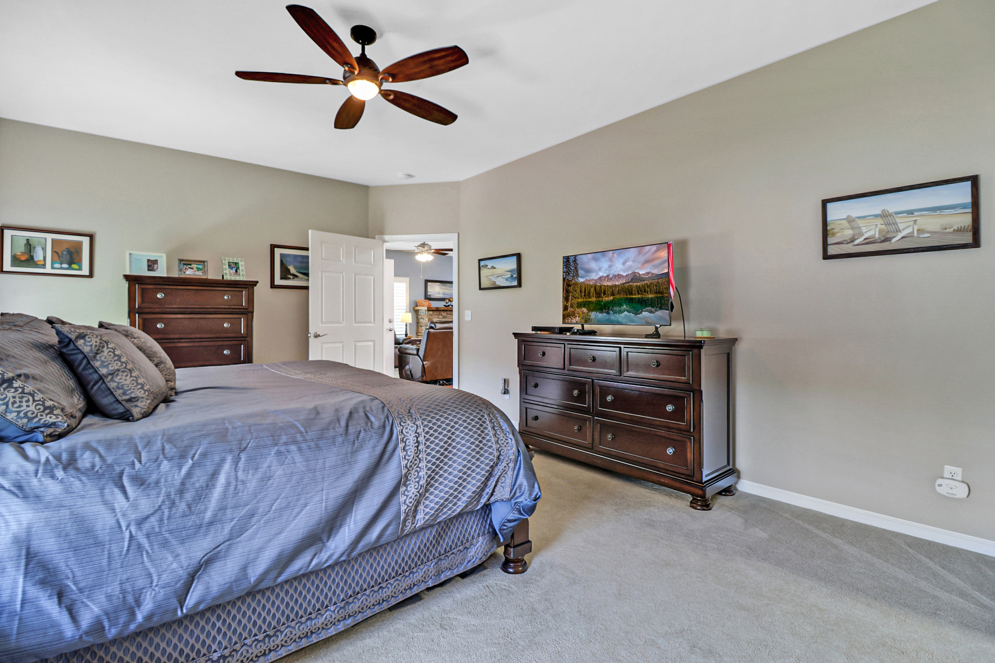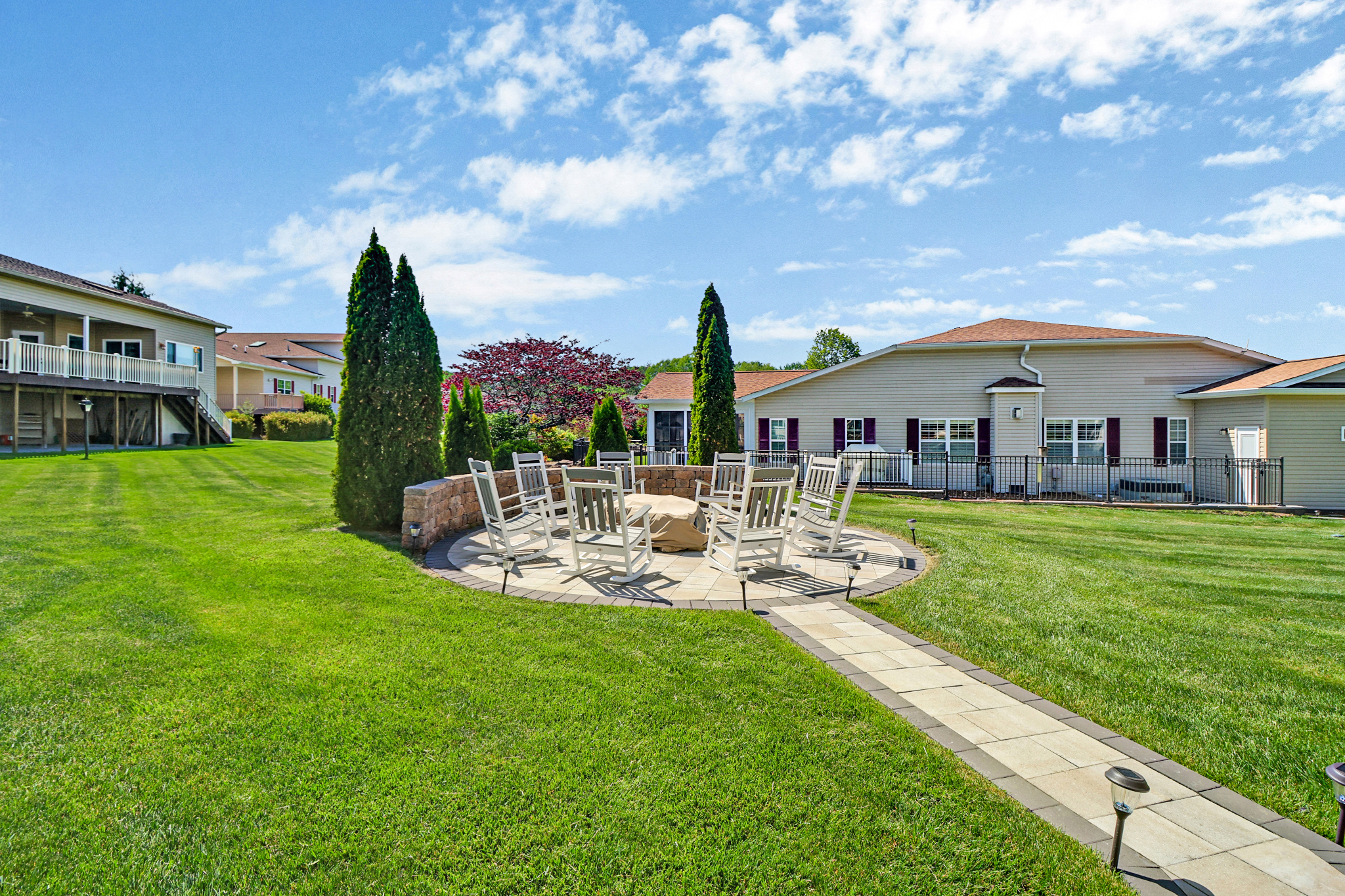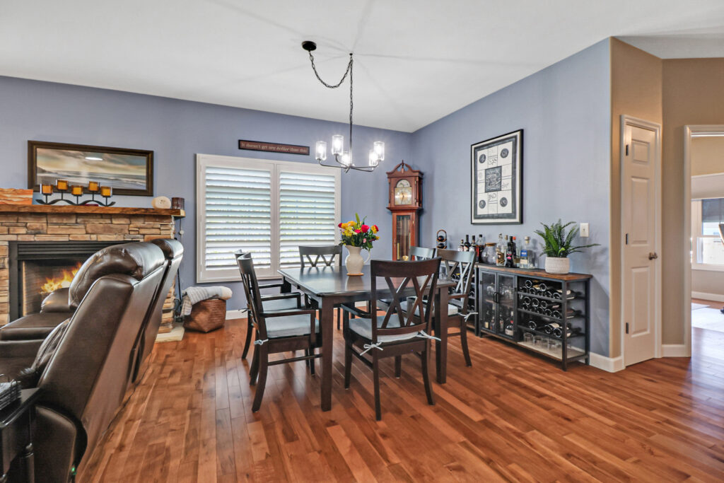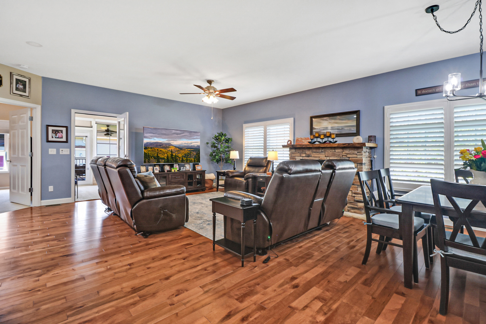 The outdoor living spaces truly elevate the property. A covered composite deck with ceiling fan creates a comfortable space for outdoor dining or relaxing through multiple seasons. Just beyond, the backyard opens to a beautifully designed paver patio and gas fire pit area surrounded by retaining wall seating, privacy-enhancing evergreen landscaping, and open green space that feels both inviting and usable. Whether hosting guests or enjoying a quiet evening outside, the layout was clearly designed with lifestyle in mind.